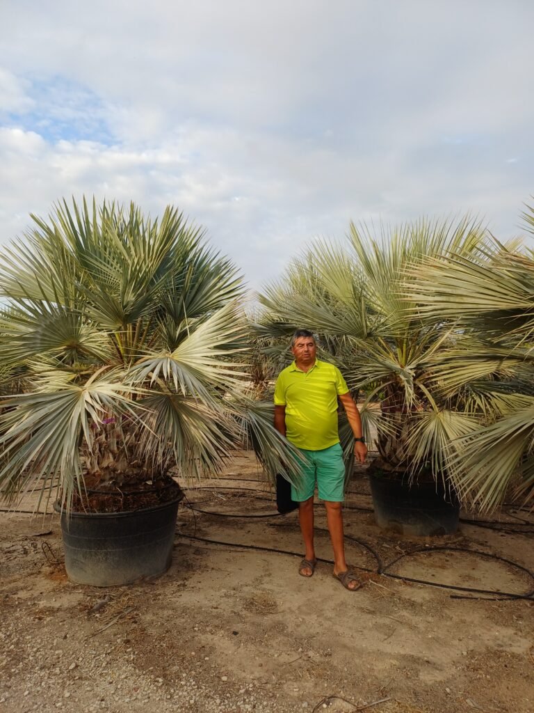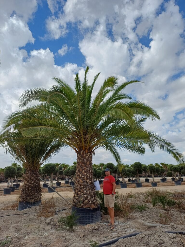 stipe 1,80m en pot de 450 litres, hauteur hors pot + 4m (le feuillage est attaché sur la photo)